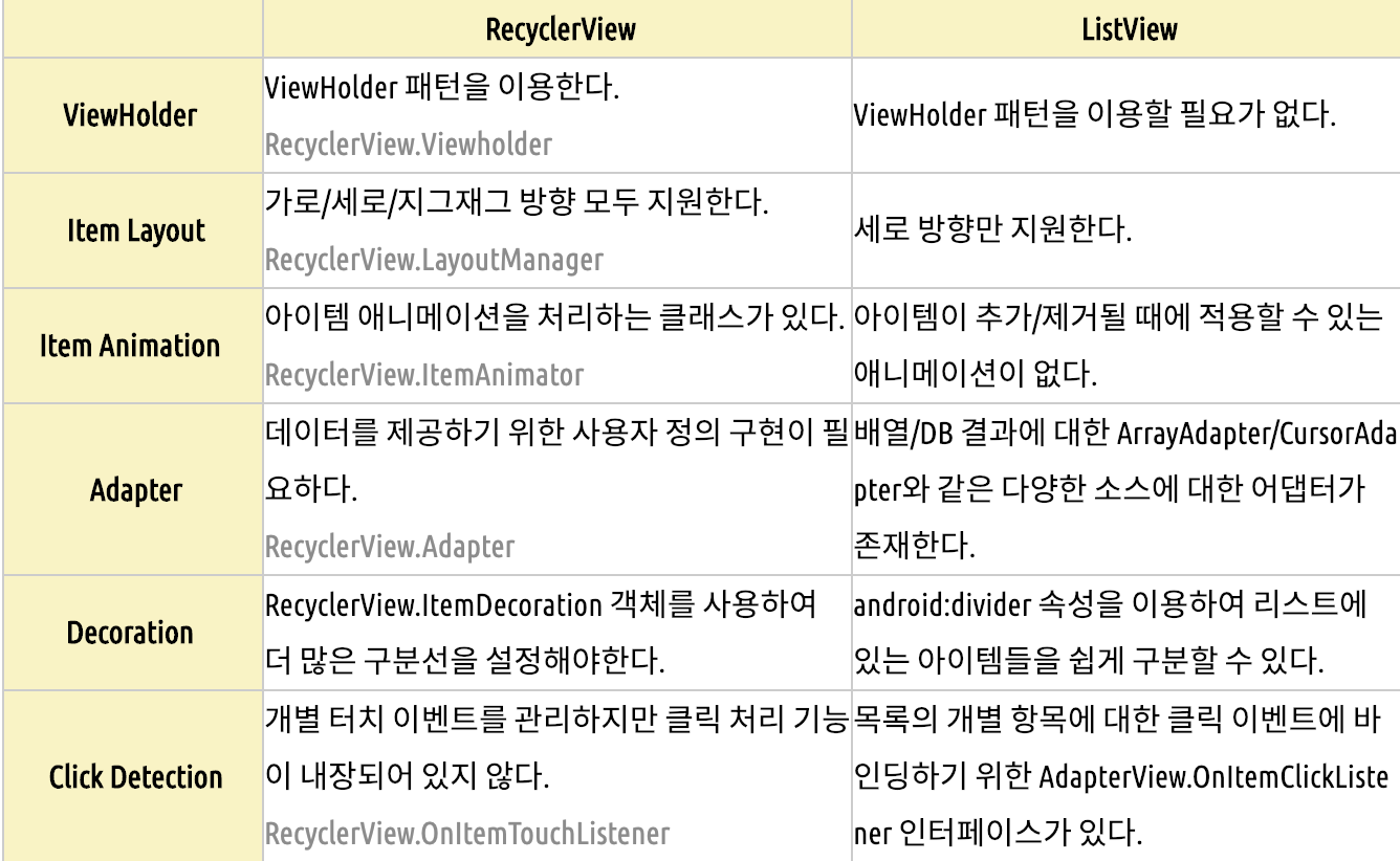 리사이클러뷰나 리스트뷰는 리스트 형태의 뷰로 보여주기 위해 사용되는데, 차이점은 다음과 같다.