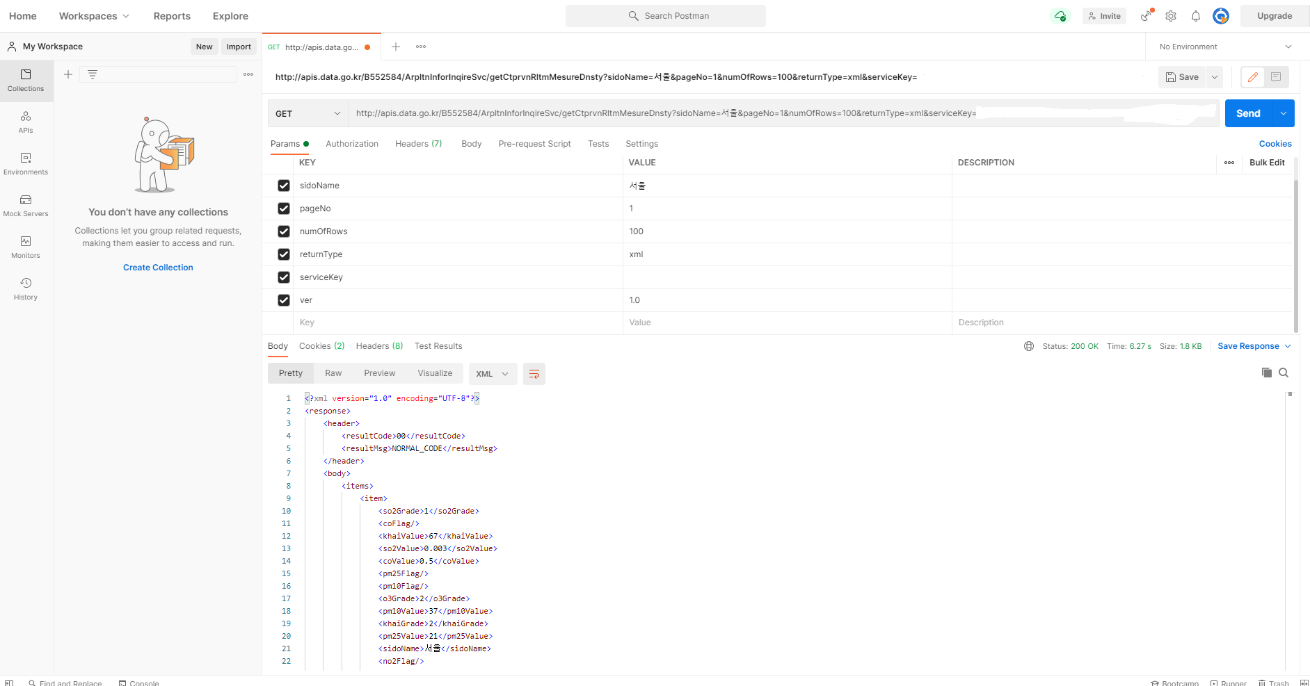 - 공공데이터 포털에서 제공하는 한국 환경공단_에어코리아_대기오염정보의 시도별 실시간 측정 정보 조회를 사용