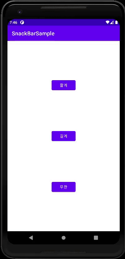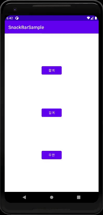 ※ SnackBar는 잠시 후 자동으로 사라지기 때문에 메시지를 보거나 버튼을 누를 수 있다는 기회를 기대할 수 없습니다. 이러한 이유로 작업을 수행하는 다른 방법을 제공하는 것을 고려해야 합니다.